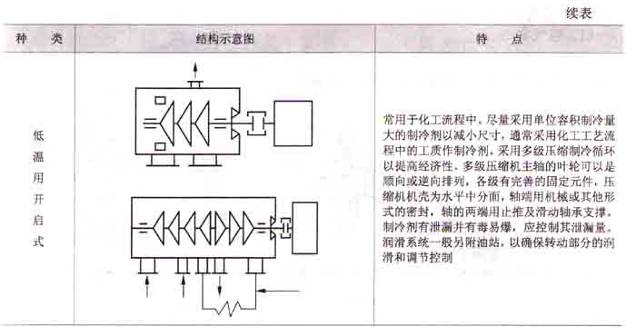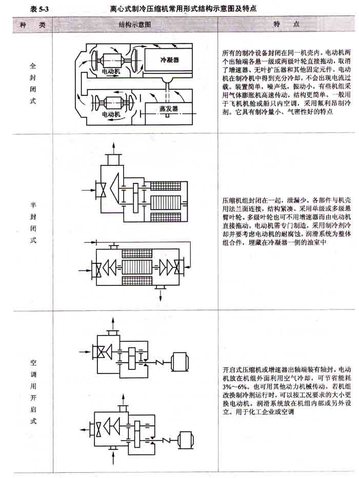 離心式制冷壓縮機與其他類型的制冷壓縮機一�,根�(jù)封閉結構的類型分為三種類型:開式,半封閉式和全封閉式� 如表5-3所示,示出了離心式冷凍壓縮機的一般類型示意圖和特��