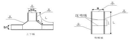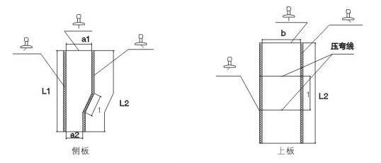 1� 矩形可變直徑管(靴管)的放樣� 矩形可變直徑管通常由四�(gè)板組成� 首先,根�(jù)�(shè)�(jì)要求,將�(cè)板布置在板上,然后測(cè)量側(cè)板可變直徑邊緣的�(zhǎng)�,并根據(jù)�(cè)量的�(zhǎng)度布置頂�� 繪制截止線,45度斜�,彎曲線或V形槽�,如�5.2.2-4所示�