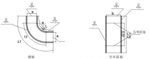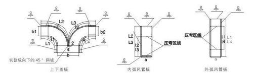 1)矩形彎頭(彎頭,S形彎頭)的放樣� 矩形彎頭通常由四�(gè)板組�� 首先,根�(jù)�(shè)�(jì)要求,將�(cè)板釋放在板上,然后測(cè)量側(cè)板彎曲邊緣的�(zhǎng)度� 根據(jù)�(cè)板彎曲邊緣的�(zhǎng)�,放置內(nèi)外弧形板的矩形形狀� 畫出截止��45度斜線和彎曲帶線,如�5.2.2-3所示�