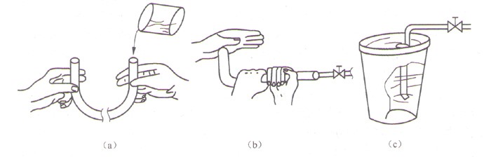 添加注釋�,可以先將管道末端向上旋�(zhuǎn),然后填充溶液或蒸水。如�5-58�a)所�,用手掌�(guān)閉一�,將一端連接到機(jī)器的流體端口。將棕櫚堵塞的一端浸入容器中溶液的液體表�,打開蓋子,如圖5-58�b)所�。容器中的溶液自動在�(jī)器中的負(fù)壓下吸入�(jī)器。如�5-58�c)所��
