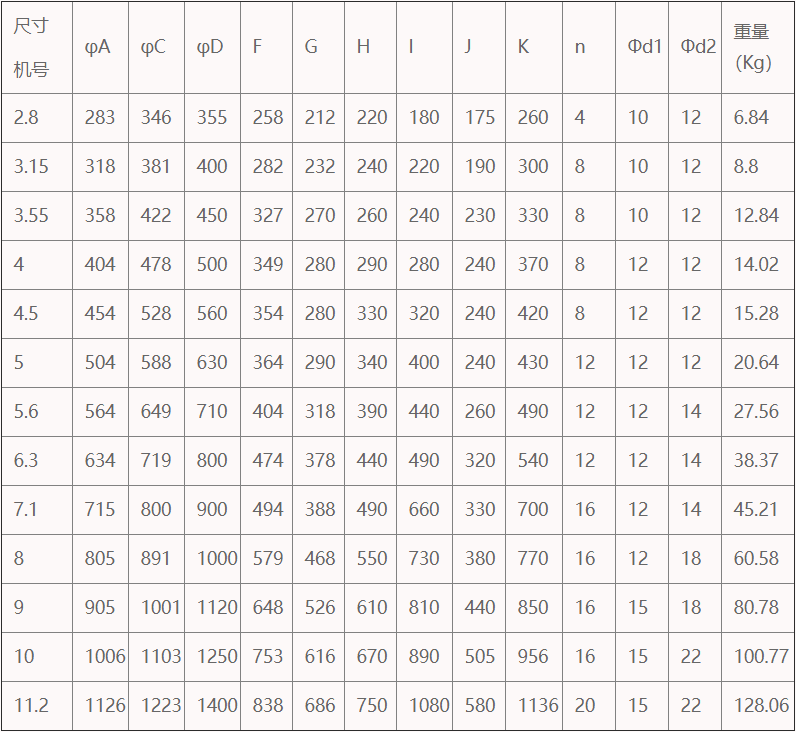 T35-11軸流風機按葉輪直徑分�13個編�,分別為:2.8�3.15�3.55�4�4.5�5�5.6�6.3�7.1�8�9�10�11.2。軸流風機分�15��20度�25��30度�35度五個葉片安裝角�